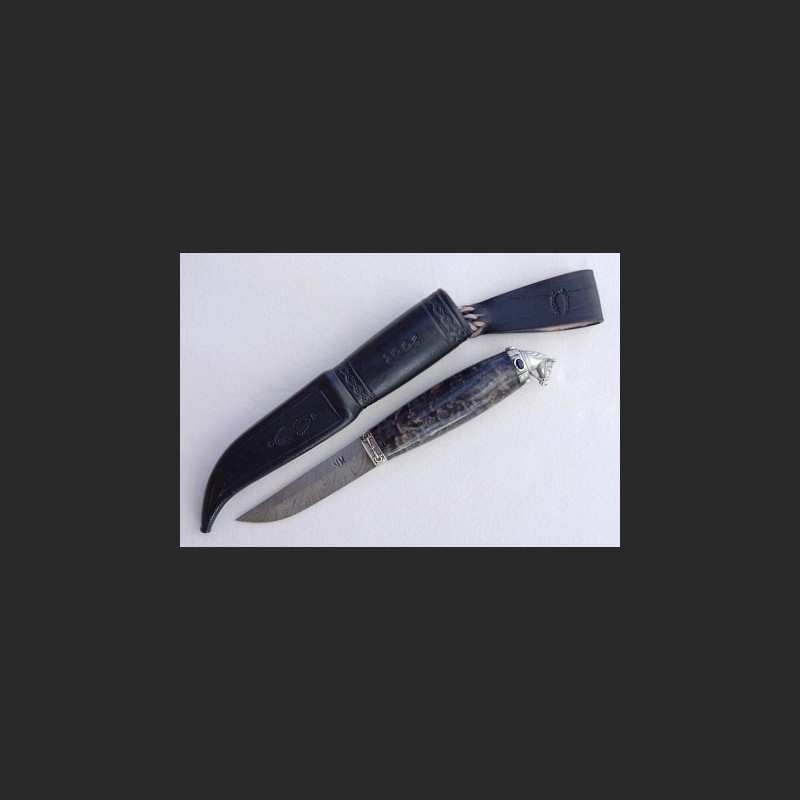 Damaskusterä ja valetut hopeahelat kiviupotuksin. Kahva mustaksi värjättyä visakoivua.