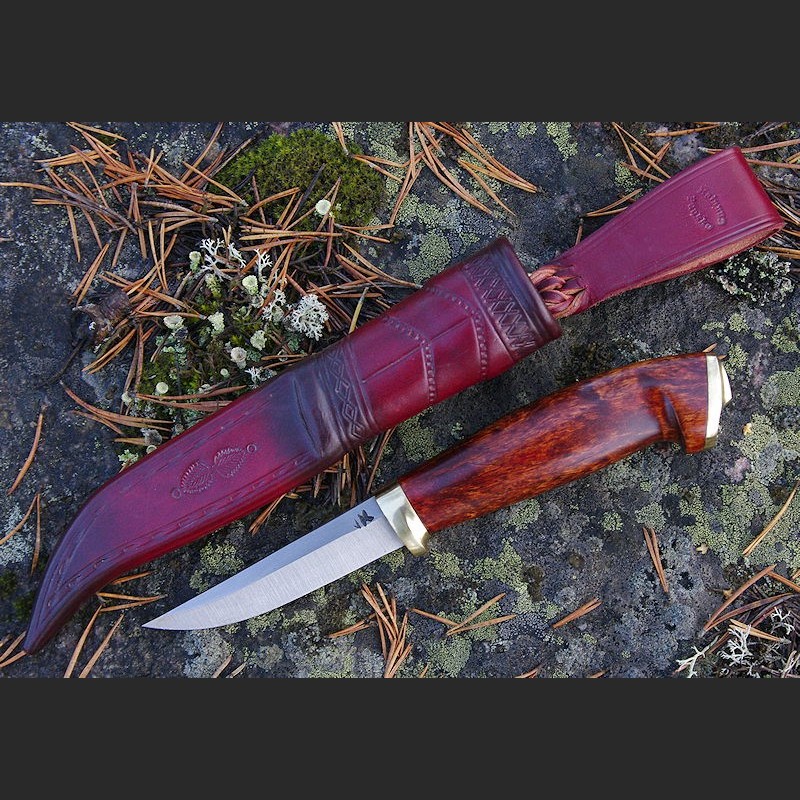 Tässä näyttävässä puukkomallissa on valettu sormisuoja. Kahva on visakoivua ja terä hiiiterästä.